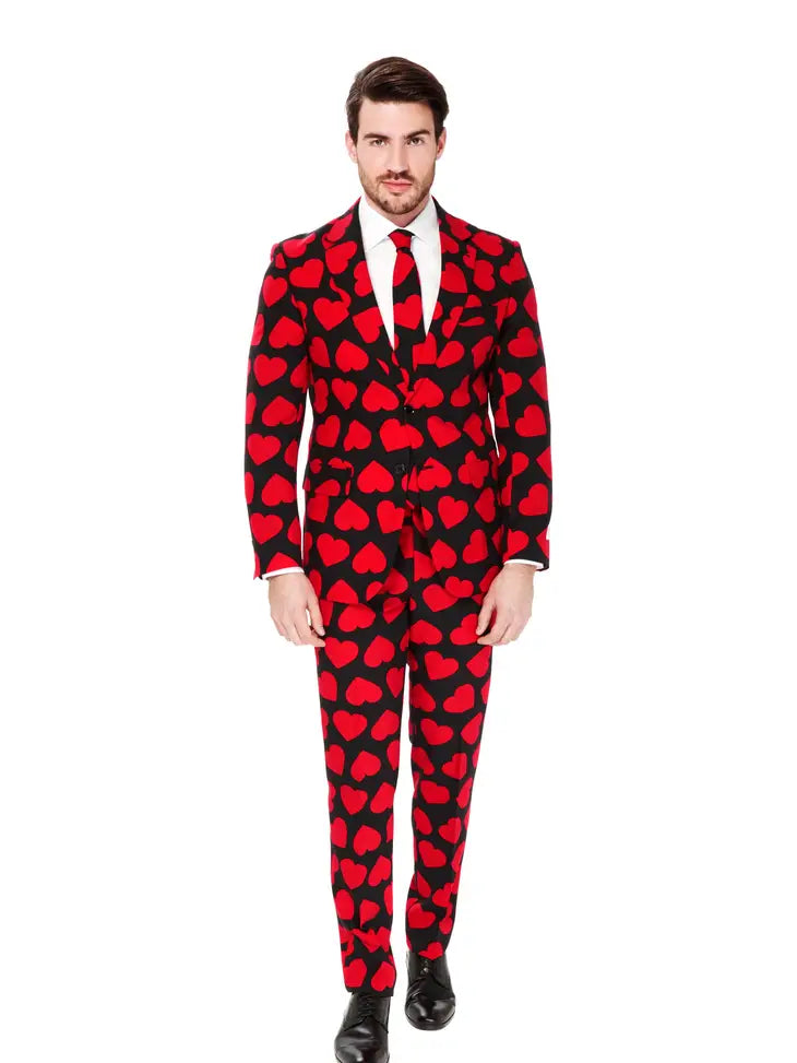 If you want to be treated like a king, you must first dress like a king. Doing so has never been easier than with our King of Hearts suit. This stylish black suit with red hearts will give you the royal appearance you deserve.