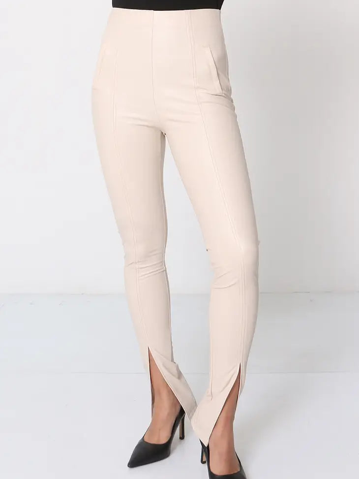 Faux leather leggings, high waist, lined, seam detail, faux pockets, slit at the bottom of the pants.