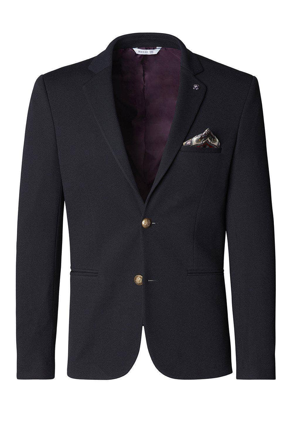 2 gold button closure notch lapel blazer. Full lining with interior pockets, pin panel on collar, chest welt pocket, and slit pockets on the side.