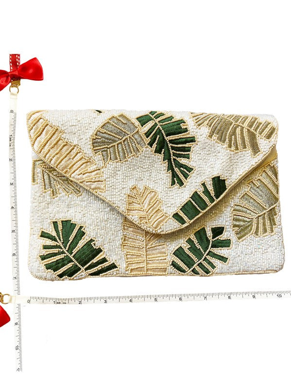 Green/white sequin leaf bag with gold chain